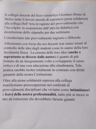 E’ la proposta di un gruppo di colleghi che chiede al collegio un atto di solidarietà ufficiale verso una collega